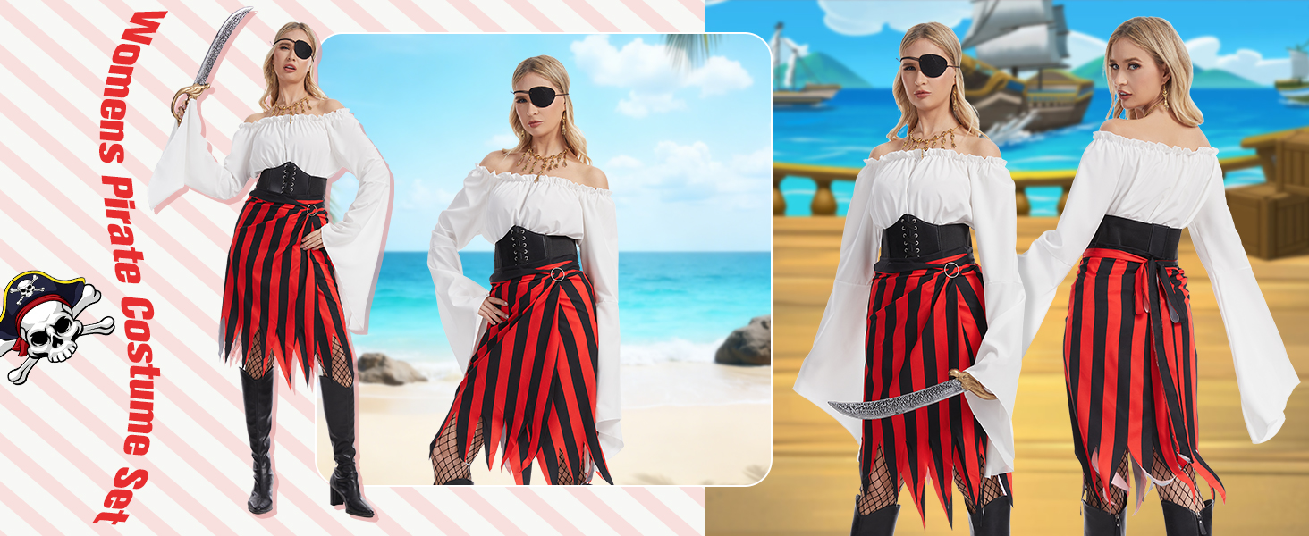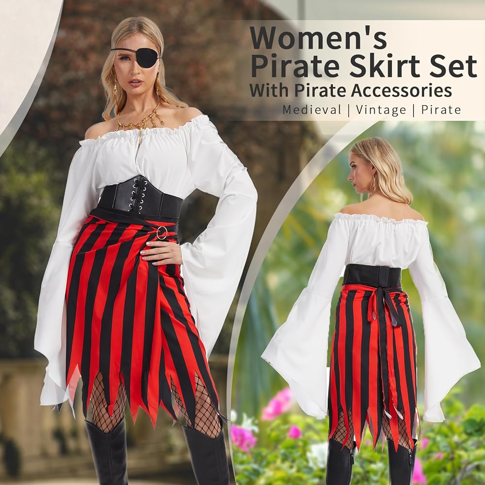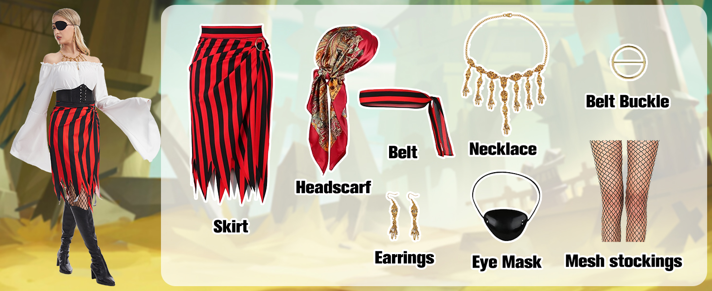 Women Pirate Costume Set -- includes a pirate skirt, a square head scarvesred, a red and black striped headscarf, a black eye patch, skeleton necklace and earring, a belt buckle.pirate accessories can easily create good pirate shape.