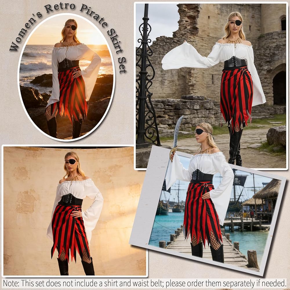 Pirate-Themed Design -- The pirate skirt features an innovative wrap-around cut, paired with an adjustable belt and metal ring fastening.The pirate bandana and skirt employ a classic red-and-black striped design.square head scarvesred can be worn as a headscarf, neckerchief, or wristband.Can quickly complete the modeling with tops or shirts, which is convenient and fast.
