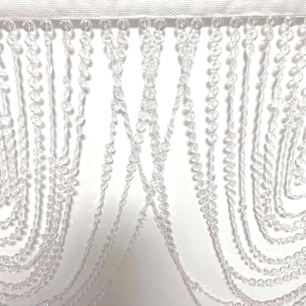 Transform Your Space with Sparkling Elegance Update your home or event décor with these Acrylic Crystal Beaded Curtain Valances, designed to add a sparkling accent. Product Specifications (Per Valance): Quantity in Pack: 2 Overall Size: 42" Wide x 23" High Fabric Top: 42" Long x 3" Wide, White Polyester with Rod Pocket Bead Chains: 33 Chains, each approximately 20" long Material: Acrylic Crystal Beads & Polyester Fabric Key Features: Elegant Design: Features a triple swag diamond cut design for a layered, dimensional look. Versatile Use: Suitable for doorways, windows, or as room dividers to enhance various spaces. Easy Installation: Fabric rod pocket allows for quick hanging on most standard curtain rods or tension rods. Adjustable Width: The design can be scrunched or stretched to adapt to different area widths.