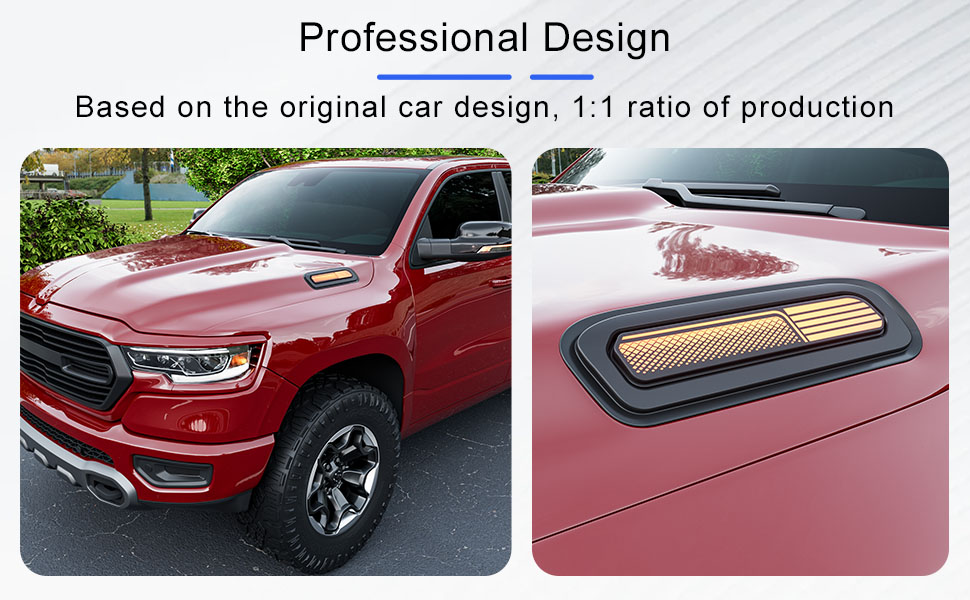 Premium Material:The hood vent light replacement for Dodge RAM 1500 hood vent scoop light made from long-lasting ABS housing paired with LED technology. ABS material is very sturdy, scratch-resistance, fade-resistance, and can withstand sunlight, rain, and outdoor environments. Engineered for extended service life, the LED deliver enhanced illumination while maintaining lower power consumption.