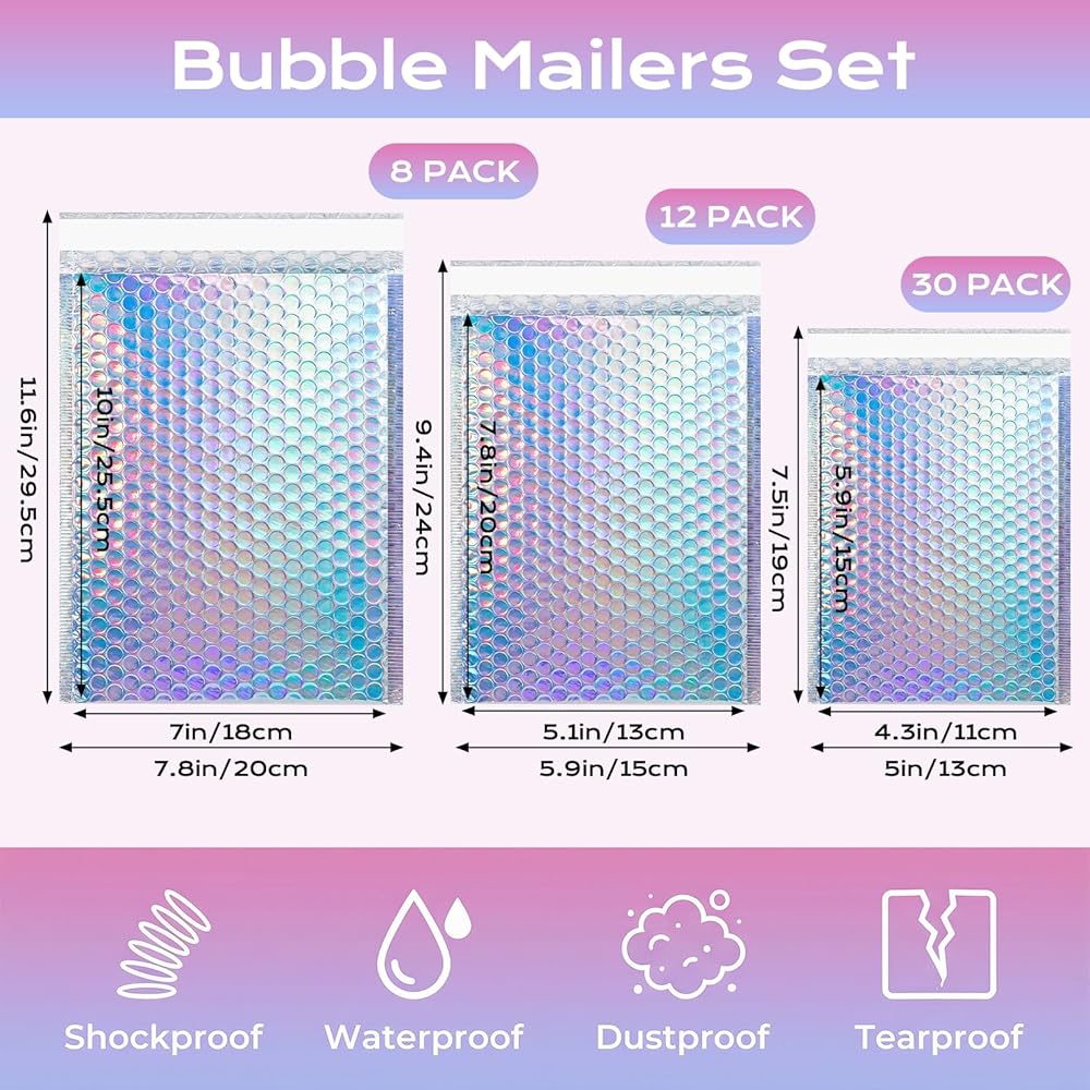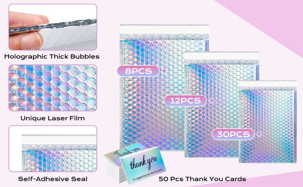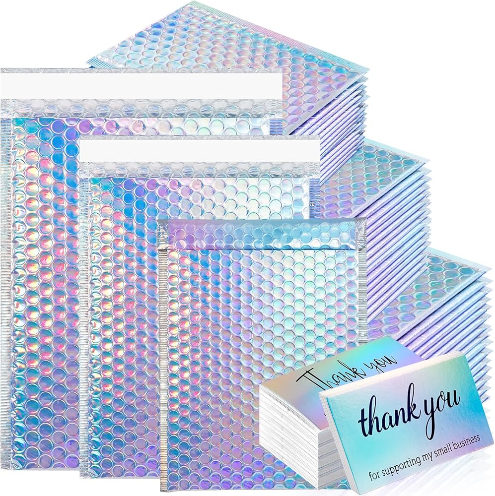 Metallic Bubble Mailers: This set includes 50 padded envelopes and 50 pcs thank you cards. Bubble mailers are available in 3 practical sizes, 8pcs 10 x 7.7in(external size), 12pcs 7.8 x 5.9in(external size), 30pcs 5.9x 5.1in(external size), helping you choose the right fit for different mailing needs.