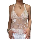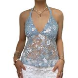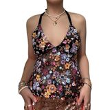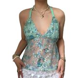 Women Y2K Sequin Mesh Tank Top Glitter Floral Embroidered Cami Crop Top Sleeveless Backless Rhinestone Camisole
