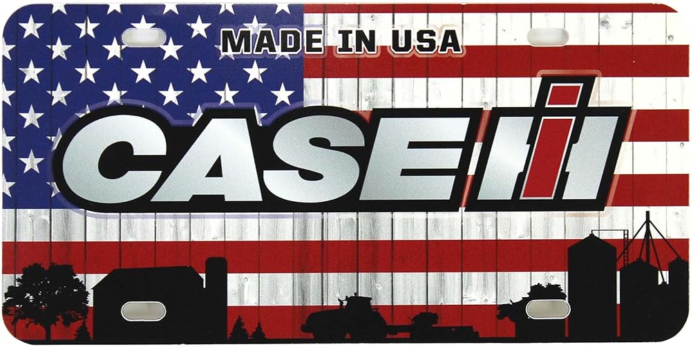 The Case IH "Made in USA" Patriotic License Plate is a vibrant and patriotic accessory for Case IH enthusiasts. This license plate proudly displays the Case IH logo along with the phrase "Made in USA" in bold letters. It is a durable and high-quality accessory that adds a touch of American pride to any vehicle.