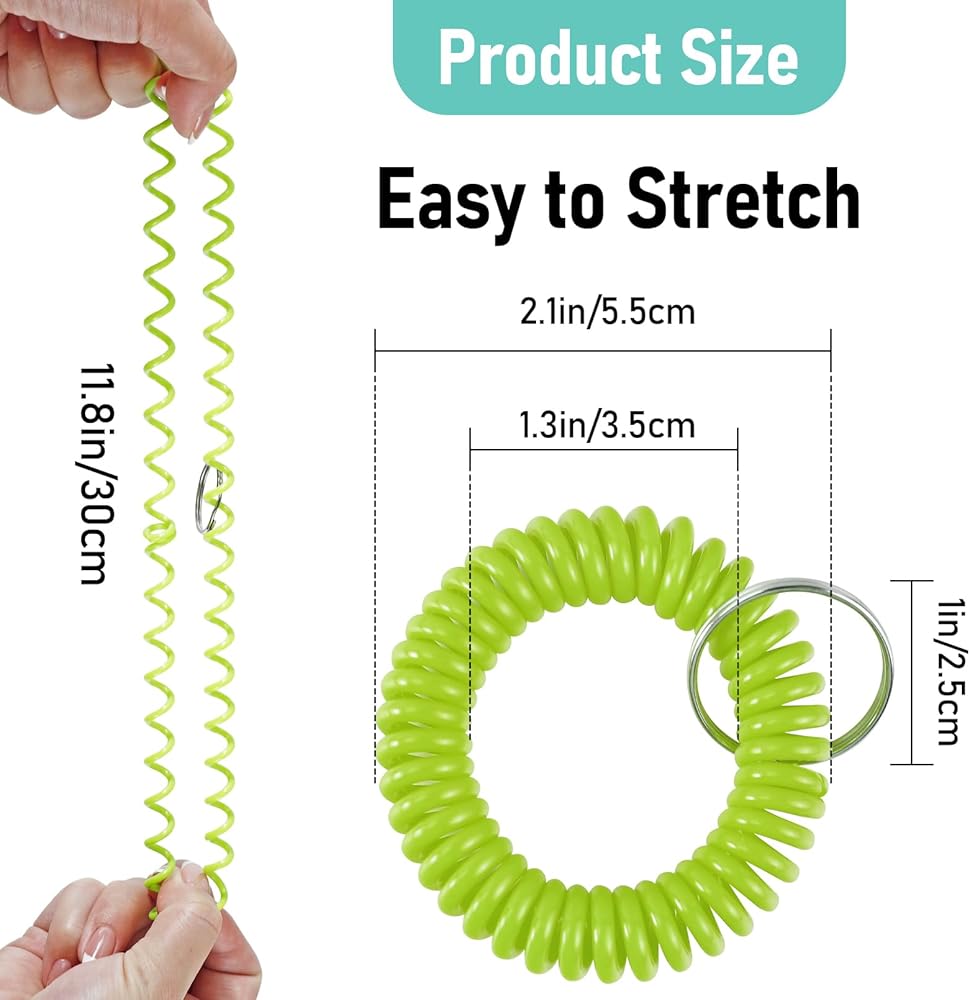 Perfect Size: Inner dia of the wrist coil key chain is 1.3 in/3.5 cm and the outer is 2.1 in/5.5 cm, and stretches to 11.8in/30cm, fits most adult wrists. Comes with a 1 in/2.5 cm metal key ring for convenient key attachment.