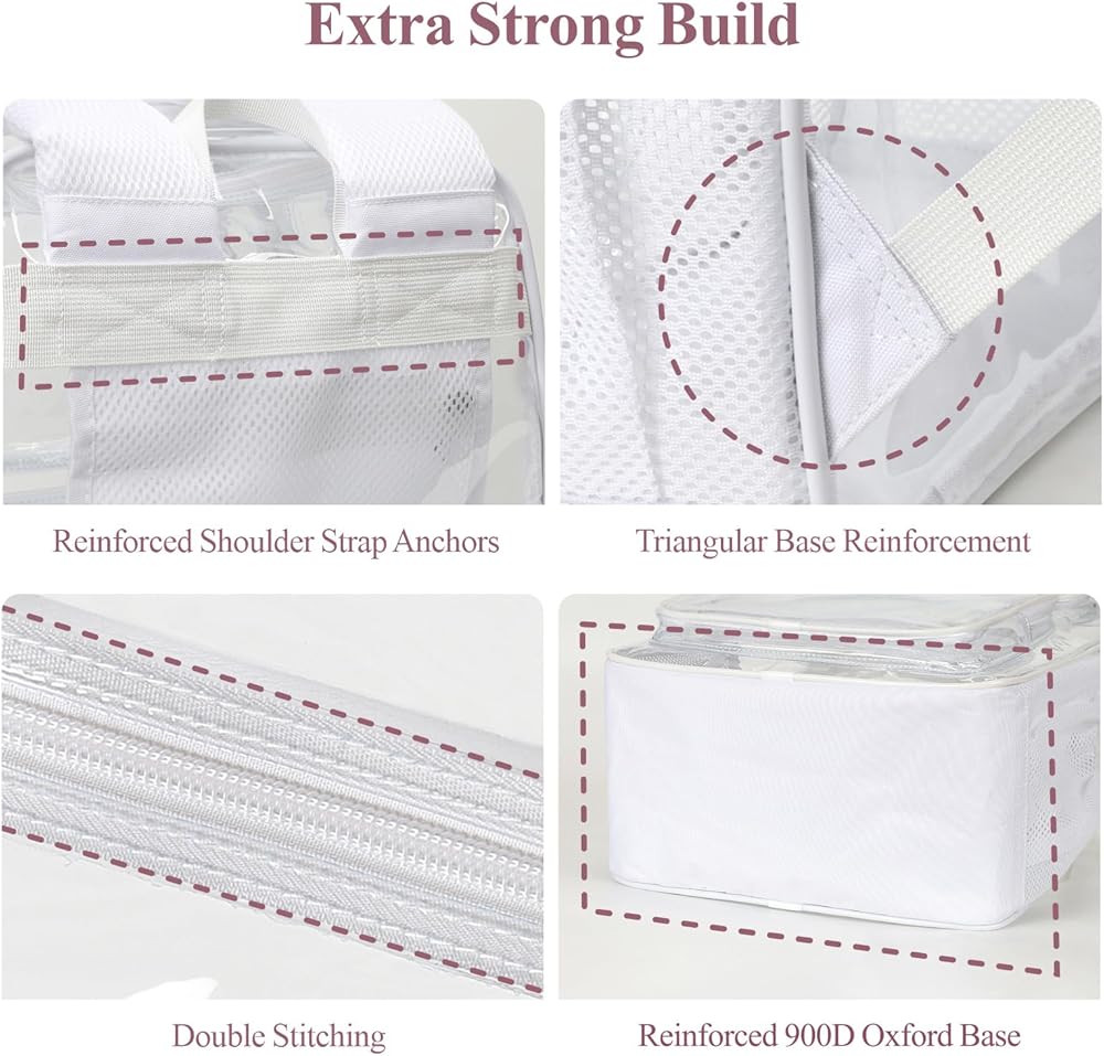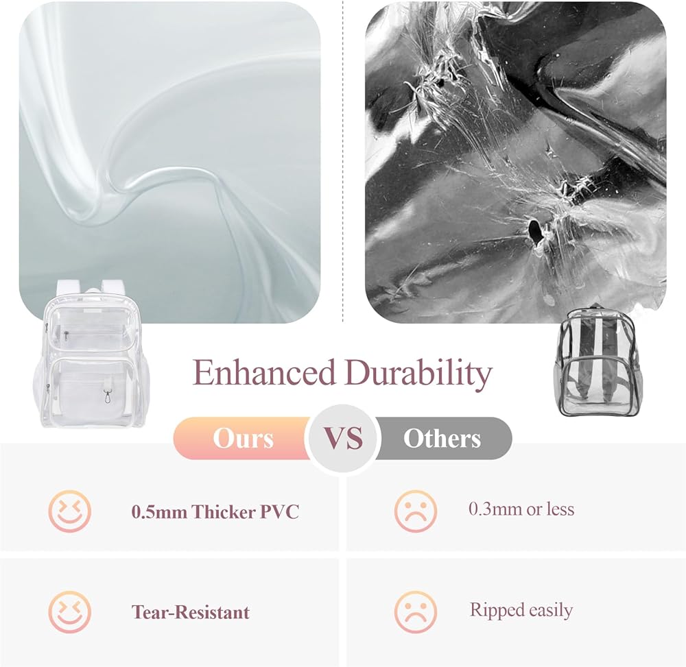 Heavy Duty Durability: Crafted from 0.5mm thick PVC with reinforced cross-stitching at strap connections, this sturdy clear backpack for school also features an abrasion-resistant reinforced 900D Oxford base for extra durability. It is tested to withstand daily wear and support heavy loads up to 22 lbs without tearing
