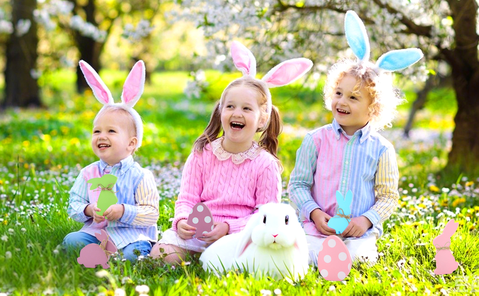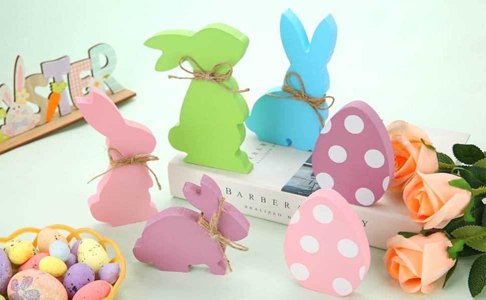 Easter Bunny & Egg Wooden Decorations: These cute pastel bunnies and Easter eggs are perfect for adding a cheerful and festive atmosphere to your Easter party or springtime decor. Colorful Wooden Easter Set: A delightful set of wooden bunny and egg shapes in soft pastel hues, perfect for Easter-themed decorations in your home, garden, or office.