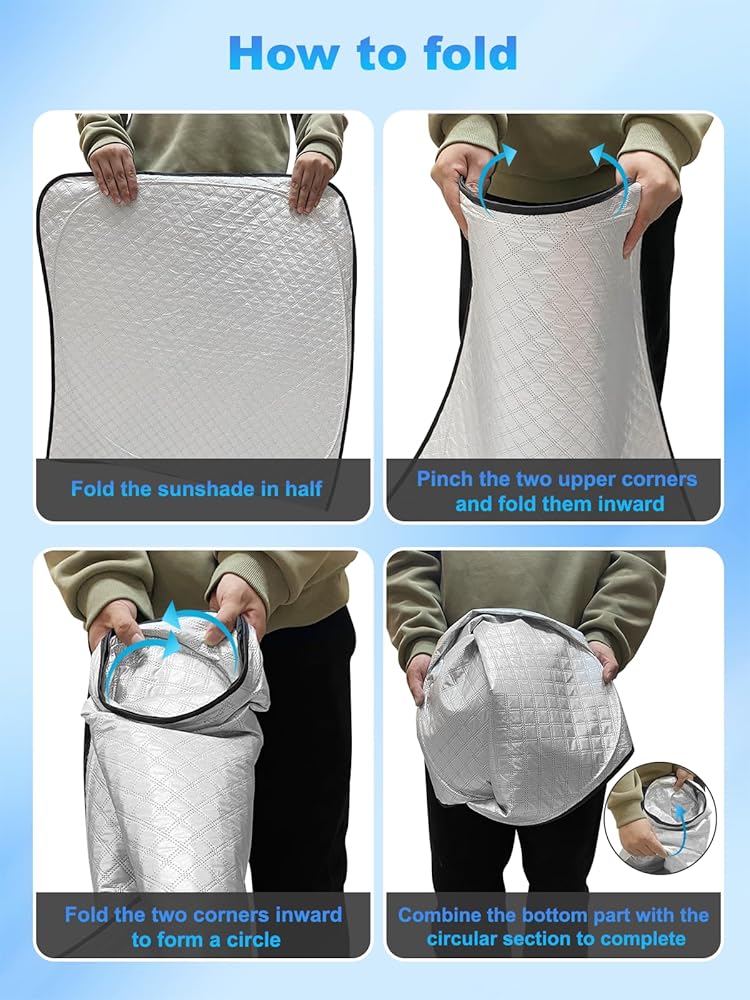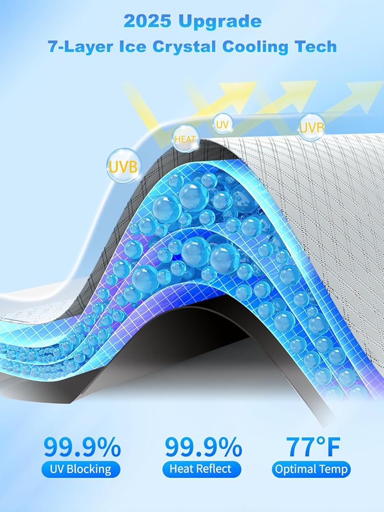 【7-Layer Upgraded Protection with Premium Materials】 This sunshade is made from the latest 2025 upgraded polyester fabric, featuring UV-reflective material and 7 layers of heat protection. It blocks 99% of harmful UV rays and keeps your car cooler by reducing heat buildup by up to 50°F. This helps protect your dashboard, seats, and upholstery from cracking and fading, while keeping the interior of your car nice and cool.
