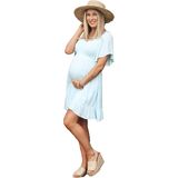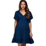 - A solid hued maternity dress featuring a v-neckline, a smocked elastic top, short ruffle sleeves, an empire waist, a ruffle hem and double lined.