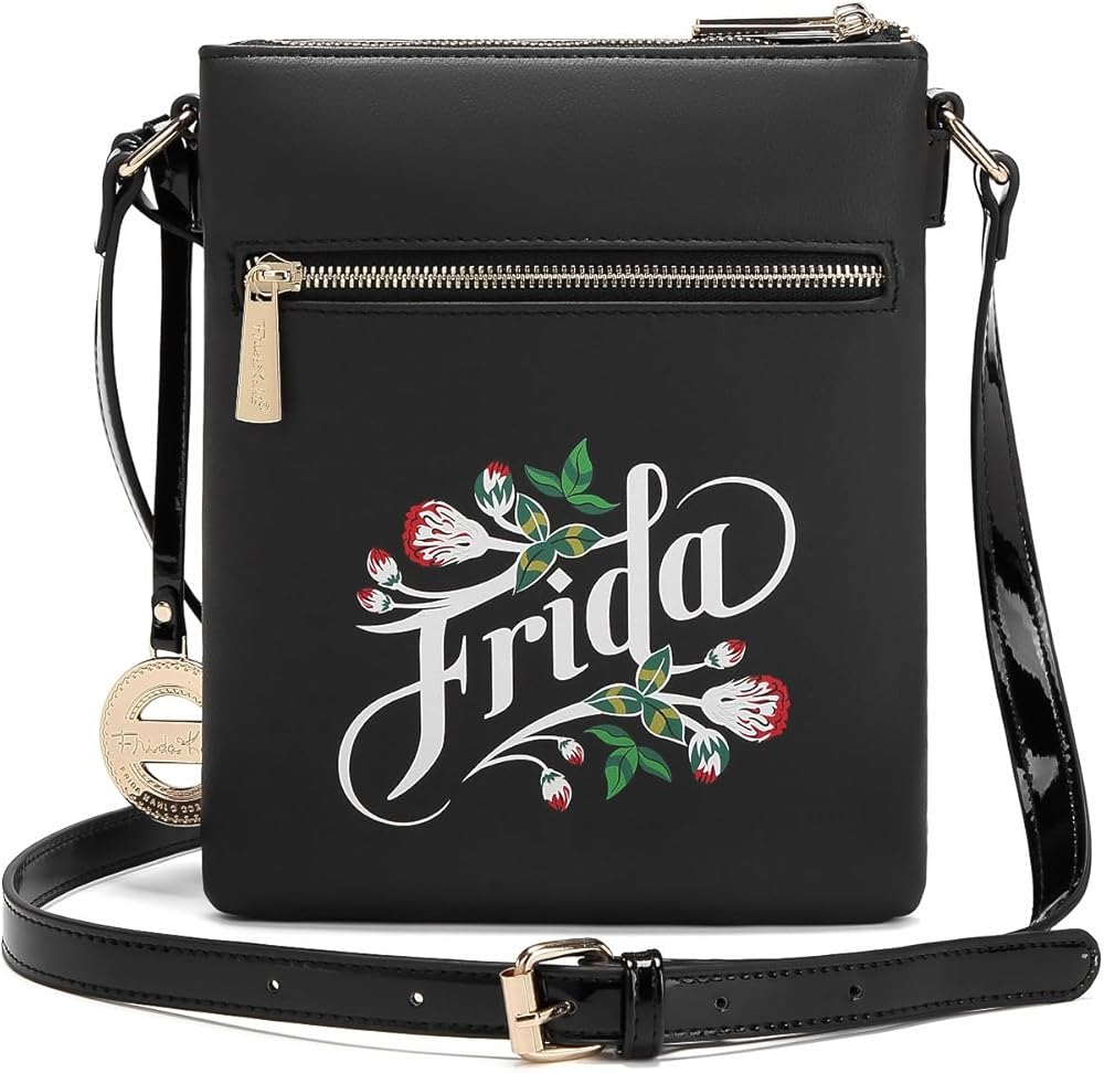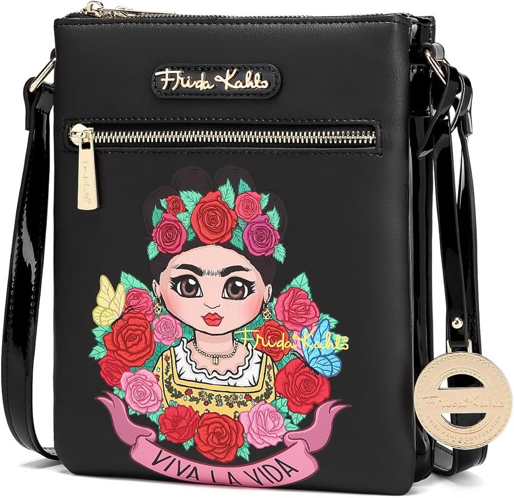 Make a bold artistic statement with this striking Frida Kahlo crossbody bag. The black faux leather exterior features a vibrant artwork design showcasing roses in red and pink hues, adorned with turquoise butterflies and green foliage. The bag's practical design includes multiple compartments with smooth gold-tone zippers, perfect for organizing your daily essentials. The adjustable shoulder strap and compact size make it ideal for everyday use, while the signature Frida Kahlo branding and decorative charm add elegant finishing touches. The interior reveals a beautifully lined beige fabric with multiple pockets for enhanced organization. This versatile accessory combines artistic flair with functional design, making it a perfect choice for both casual outings and special occasions. The durable construction and secure zip closures ensure your belongings stay safe while you showcase this unique piece of wearable art.