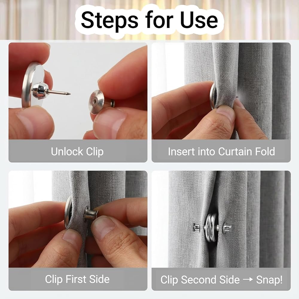 • 【Easy to Use in Seconds】: Simply pinch the small round end while pulling the cap-shaped buckle to open. Installs on curtains instantly - no tools needed! To attach the magnetic curtain to walls: (1) Align the magnetic patch, (2) Peel & stick. Lightweight yet secure.