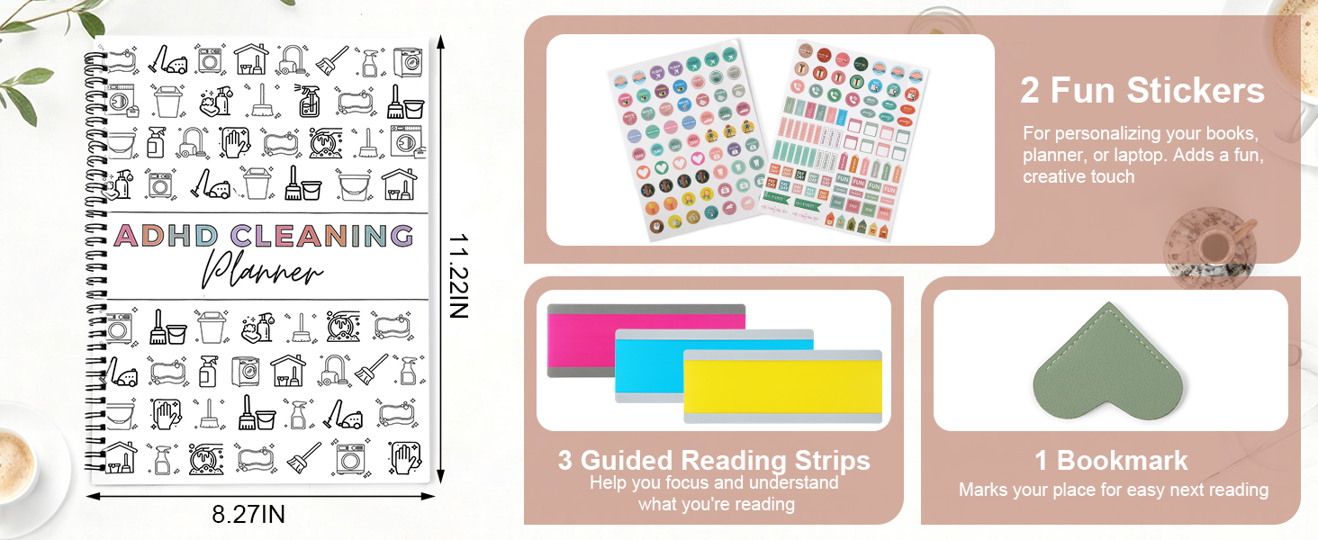 ADHD Cleaning Planner for Adults Women – Cleaning Schedule and Checklist Organizer with Guided Reading Strips and Bookmark, Daily Weekly Monthly Household Cleaning Planner