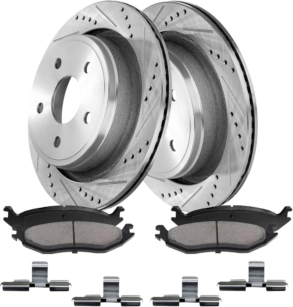 Set Includes: 2x Rear Vented Drilled and Slotted Brakes Rotors - E53006DY; 2x Rear Ceramic Brake Pads with hardware - 967DY