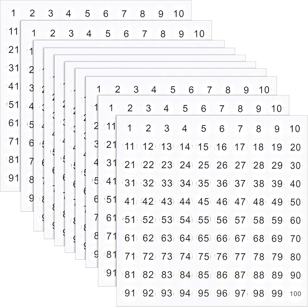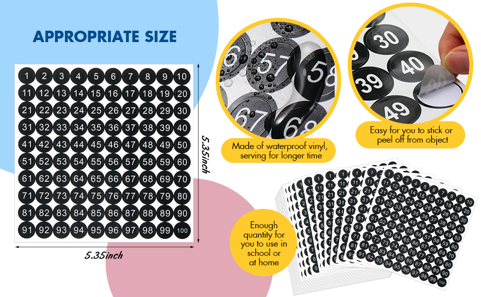 Package includes: 25 sheets round vinyl number stickers, 100 pieces for each sheet, numbered 1-100, sufficient quantity for your use; Each single sticker is 0.4 inch, and the whole sheet size is 5.35 x 5.35 inch