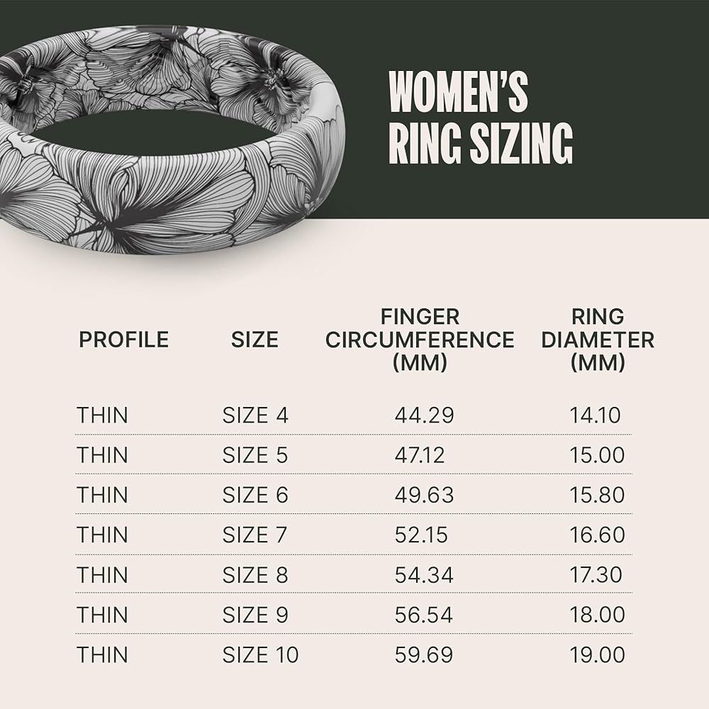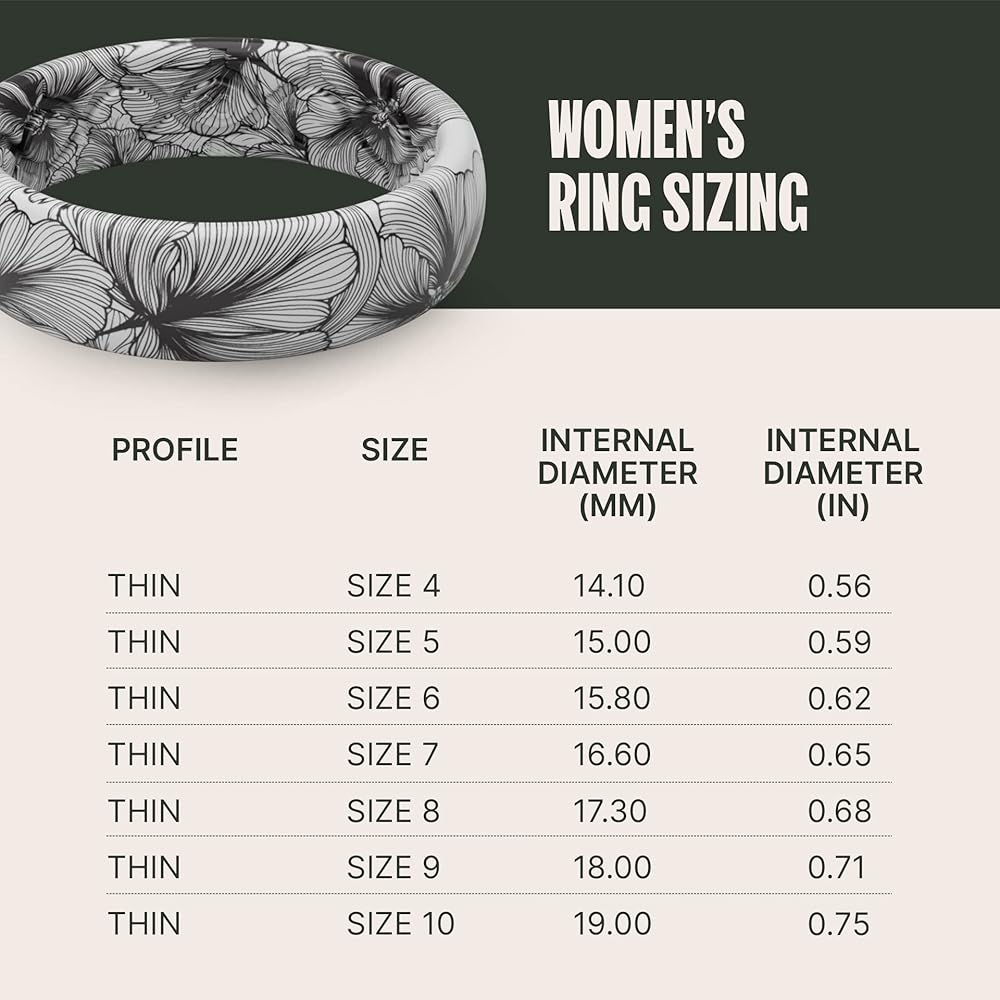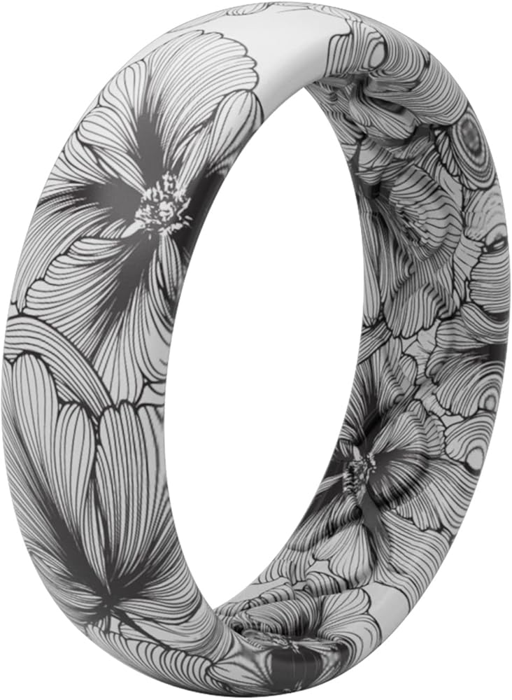 SIZING - Made from a synthetic polymer elastomer blend, which is how we can have those awesome designs! This silicone is pre-relaxed and will not loosen up after being worn regularly. If you're in-between on these, we recommend going with the next whole size up. Have a question about what size silicone ring you wear? Check out the sizing guide posted below under Product Guides and Documents. You can always call our customer service department for more assistance! (5.5mm wide)