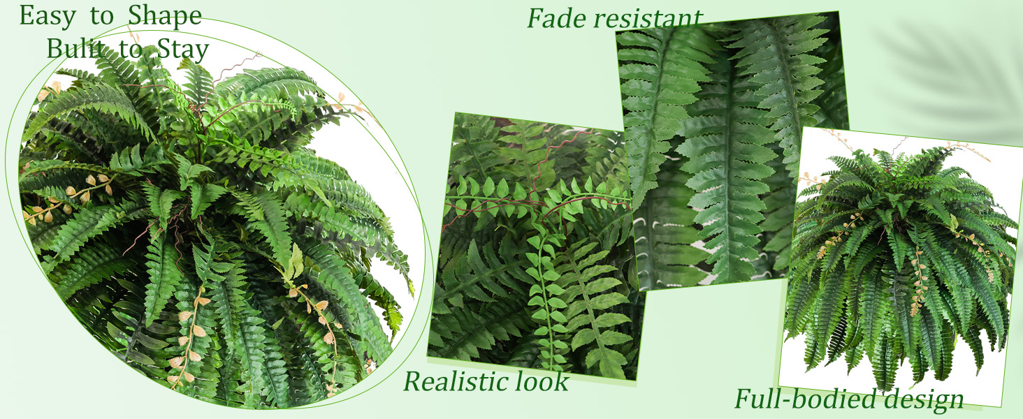 High Quality and Durable:Crafted with precision and built with a rugged internal frame, our artificial ferns are made to endure. They're constructed from UV-resistant materials and treated with fade-lock technology, so colors stay rich and vibrant season after season—rain or shine. Perfect for bringing lasting greenery to those tricky spots where real plants simply give up.