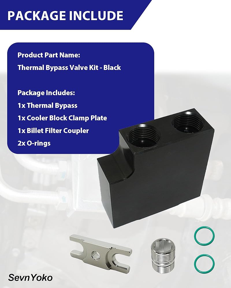 All-Inclusive 5-Piece Kit - Everything you need for a leak-free installation: 1x Black Billet Bypass Block, 1x Clamp Plate, 1x Billet Filter Coupler, and 2x High-Temp O-Rings.