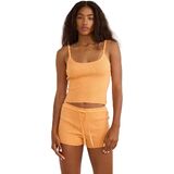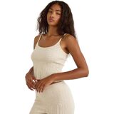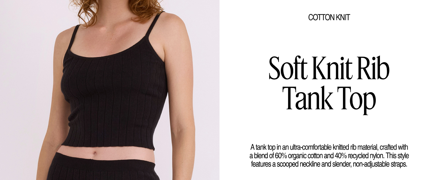 A tank top in an ultra-comfortable knitted rib material, crafted with a blend of 60% organic cotton and 40% recycled nylon. This style features a scooped neckline and slender, non-adjustable straps.