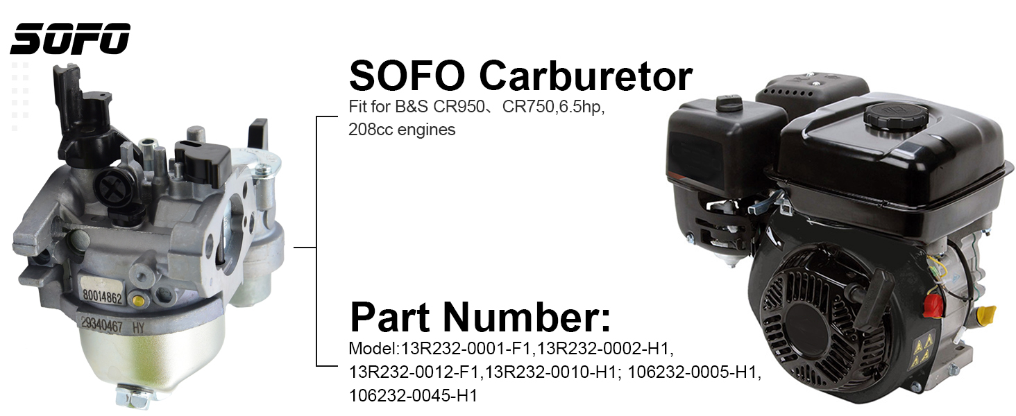 Compatibility with Briggs Stratton (Specific Models): Fit for Briggs Stratton CR950 and CR750 6.5hp 208cc engines, including the following models: 13R232-0001-F1, 13R232-0002-H1, 13R232-0012-F1, 13R232-0010-H1, and 106232-0005-H1 to 106232-0045-H1. This carburetor serves as a replacement for original carburetors with part numbers 596080, 595651, 595649, 84004577, and 595783.