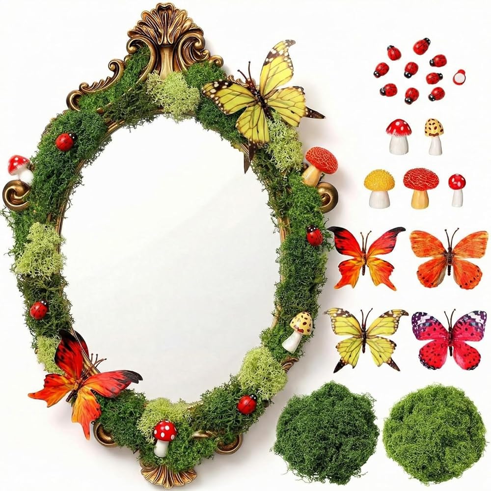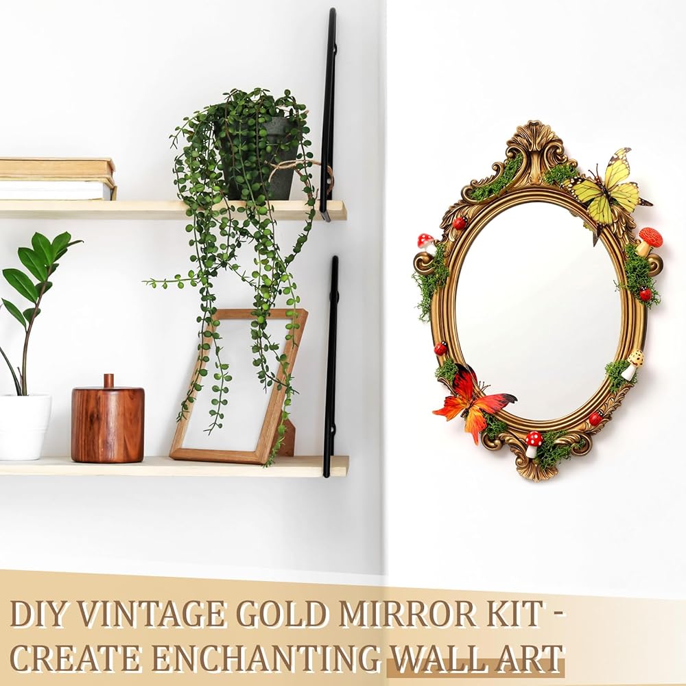 • Premium Material: The gold vintage mirror and realistic mushrooms are made of durable resin, the silky artificial moss is crafted from quality polyester, and the elegant butterflies are made of premium silk cloth, with all materials selected for exceptional quality and longevity