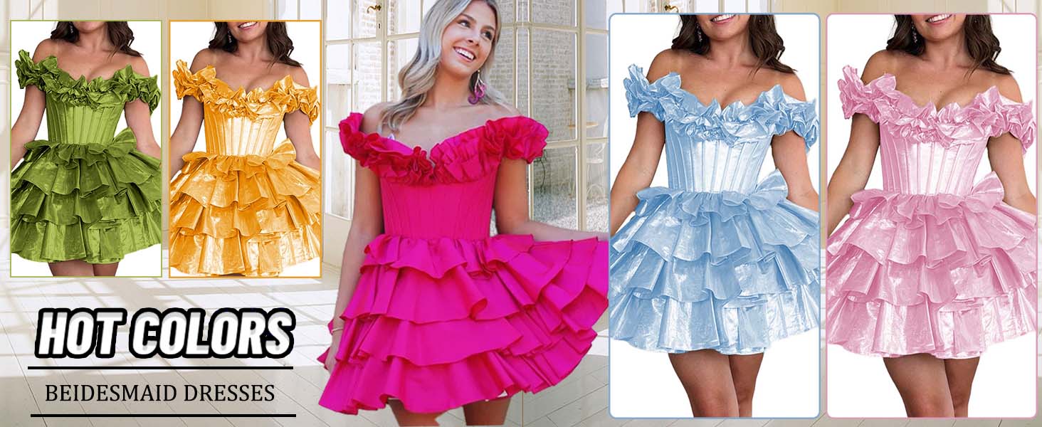 Feature:Off shoulder layered homecoming dresses 2025 , ruffle short prom dress for juniors , A Line tiered satin prom dresses for teens 2025 , short backless cocktail party dresses, layered a line mini cocktail party gowns for teens, satin ,ruffle ,layered ,tiered ,strapless ,off shoulder ,short , backless ,build in bra, fully lined .