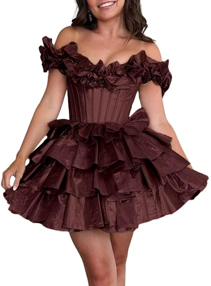 Off Shoulder Layered Satin Homecoming Dresses for Teens Ruffle Short Prom Dress for Juniors 8th Grade Semi-Formal Gown
