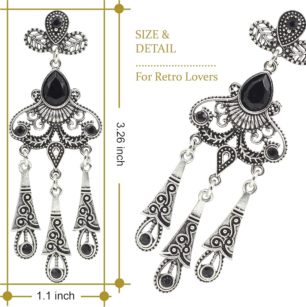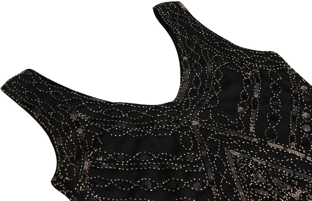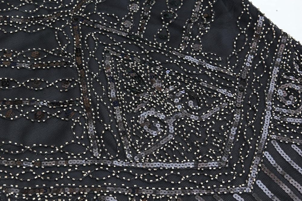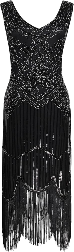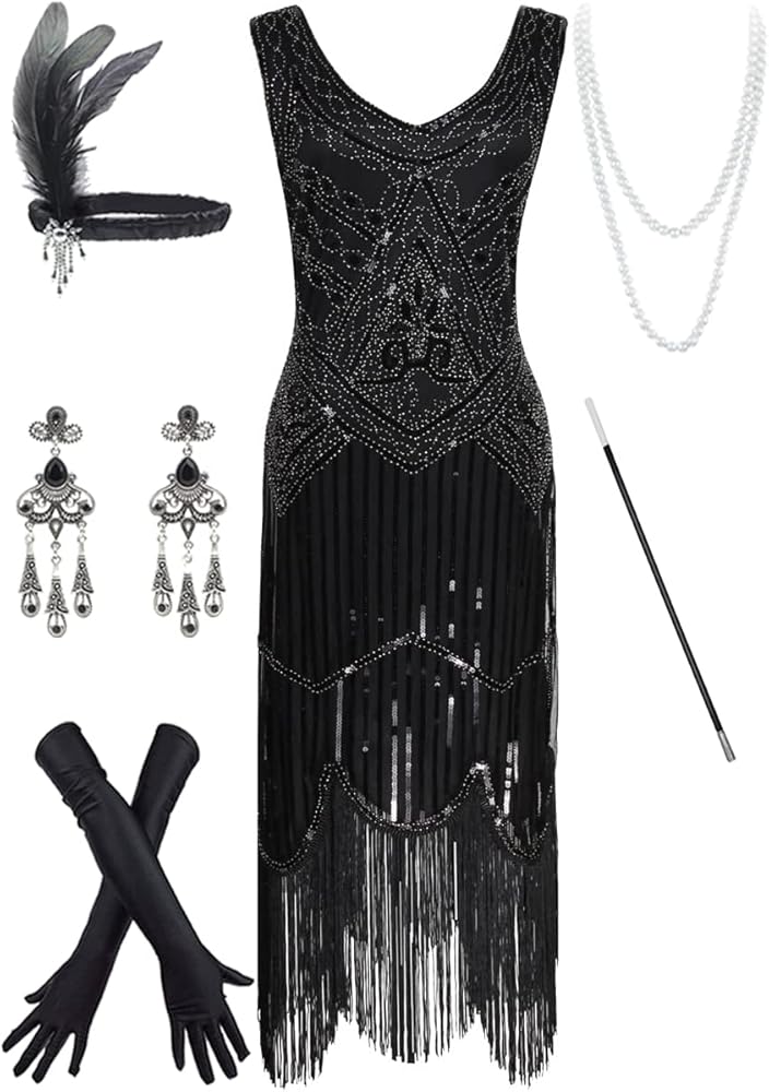 Women's Vintage 1920s Sequin Beaded Tassels Hem Flapper Dress w/Accessories Set (2X-Large, Style03-Black&Silver)