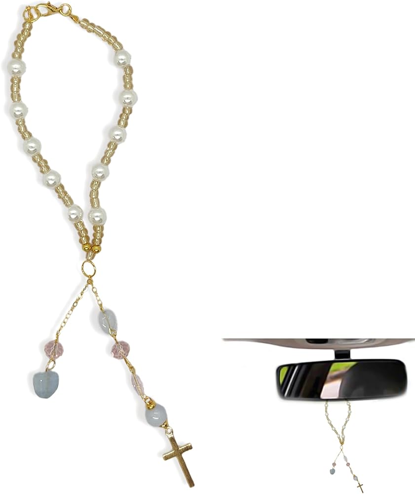Natural Jadeite Elegance: This cross for car mirror hanging ornament features natural jadeite beads, offering a warm, organic texture. Complemented by lustrous pearls and delicate glass beads, it creates a harmonious and elegant accessory for your vehicle