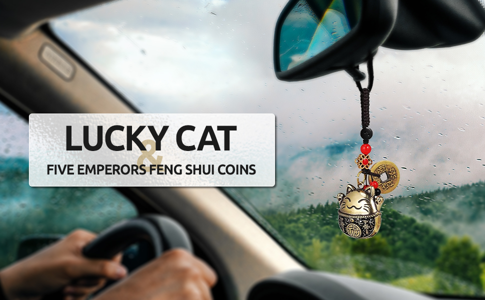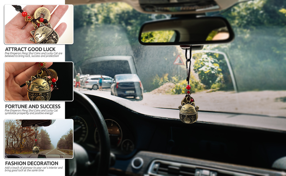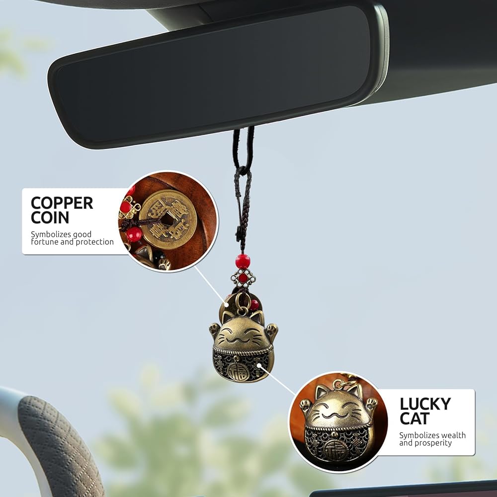 Attract Good Luck: This brass Maneki Neko cat pendant with five feng shui coins is believed to bring prosperity, success, and protection, making it a powerful good luck charm for your car