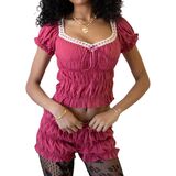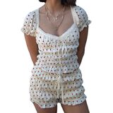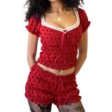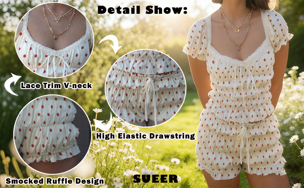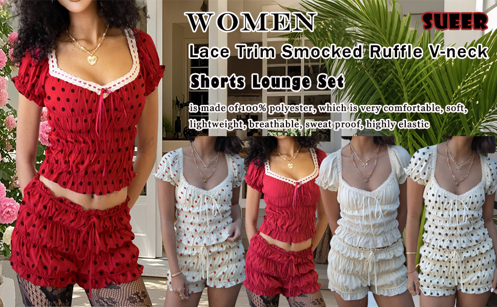 Design: Women 2pcs short sleeve top shorts sleepwear, solid color/polka dot print, short sleeve, smocked design, V-neck, lace trim, crop top, waist tie up front, women ruffle trim short sleeve top shorts pajamas set