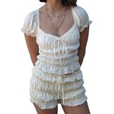 Occasion: Women smocked V-neck crop top shorts pajamas set suitable for daily fashion dressing, daily sleepwear/home wear, vacation travel, fashion photography, dating honeymoons, gatherings and dinners, clubs and so on