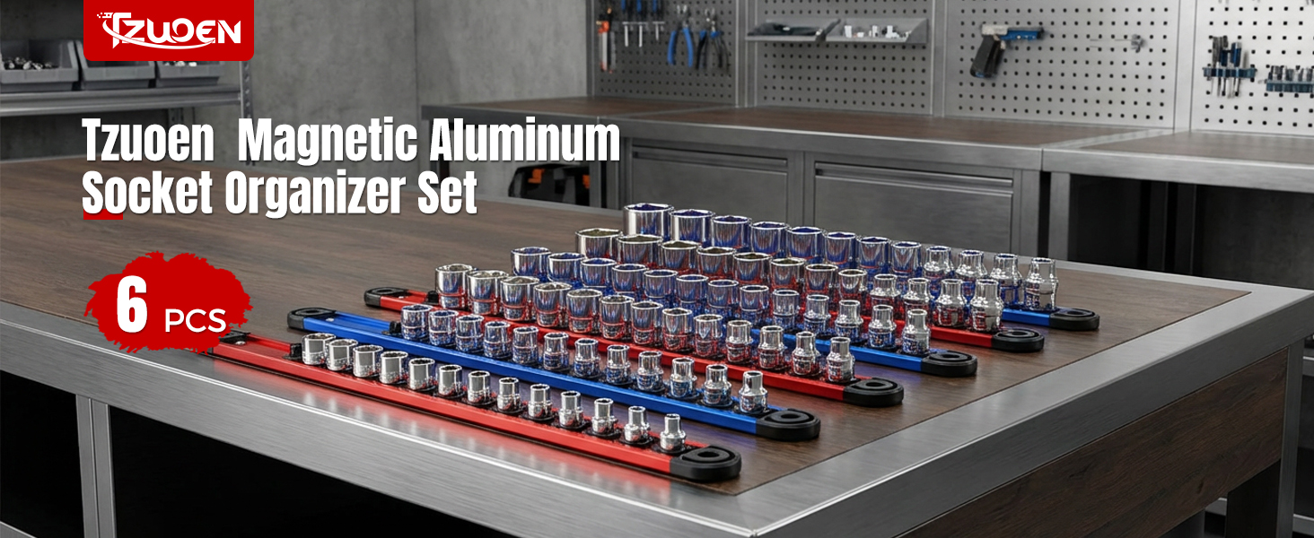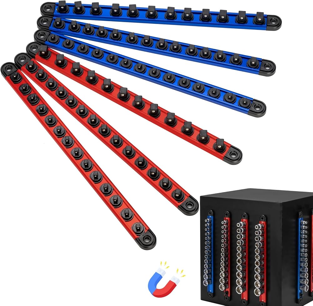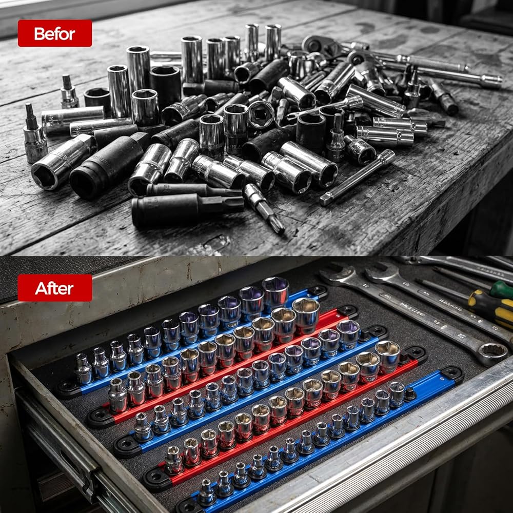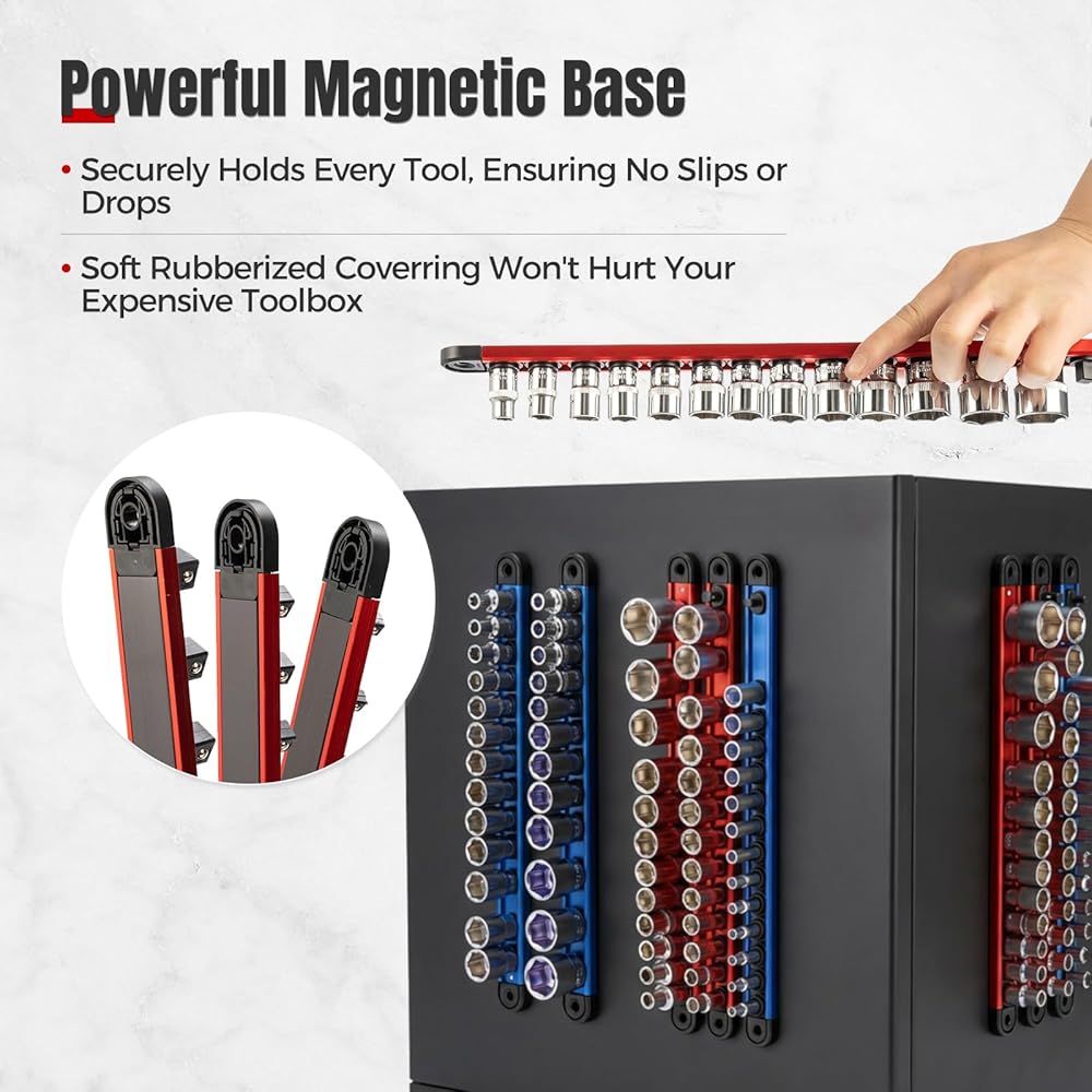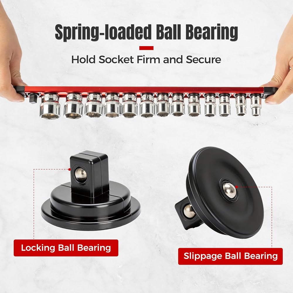 Sturdy Construction: Engineered with aluminum rails and reinforced ABS spring clips fitted with double steel ball bearings, this socket rail organizer firmly secures sockets and ensures long-lasting durability. Even when fully loaded, the magnetic holder resists deformation