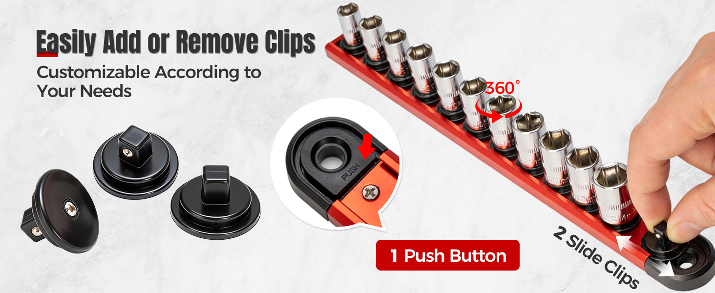 Quick Add/Remove Clips Design: Push the button on the socket tray to move the clips, easily add or remove clips as needed, enabling personalized customization, helping to optimize socket storage capacity, significantly improving tool organization efficiency, and making it an ideal socket organizer for tool box drawer