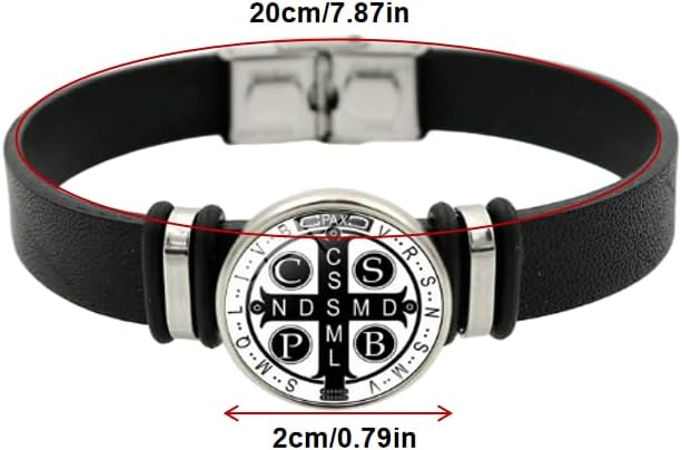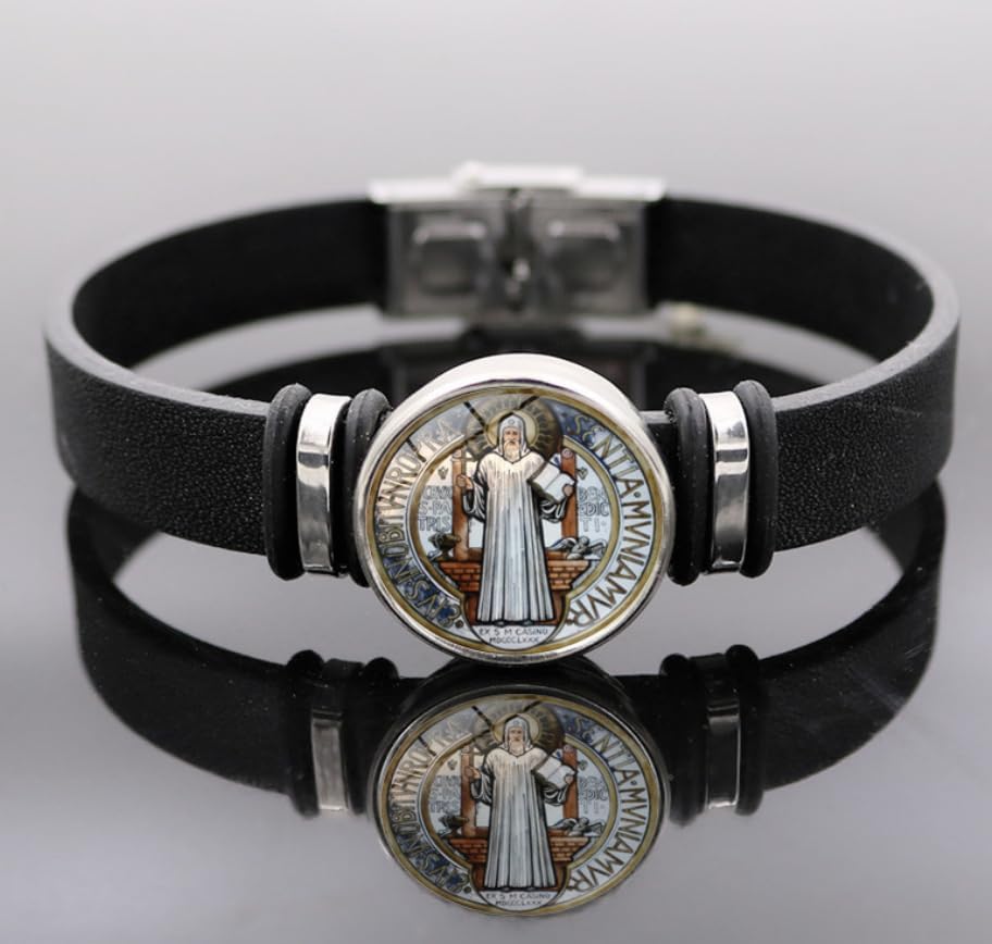 This beautifully crafted collection features a black leather bracelet adorned with the revered St. Benedict medal, a powerful symbol of faith and protection.