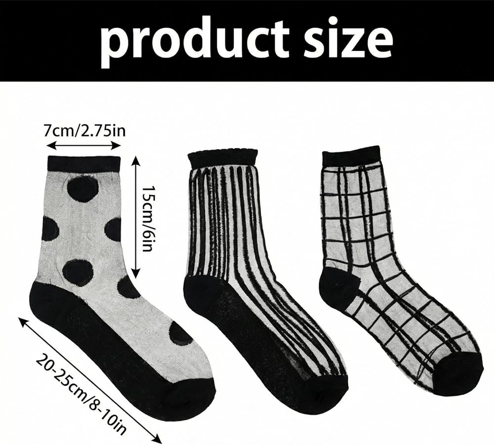 Exquisite Patterns: These womens sheer socks combine three classic and fashionable patterns: polka dots, stripes, and geometric shapes. The sheer black base exudes elegance and sophistication, easily adding a highlight to your outfit.