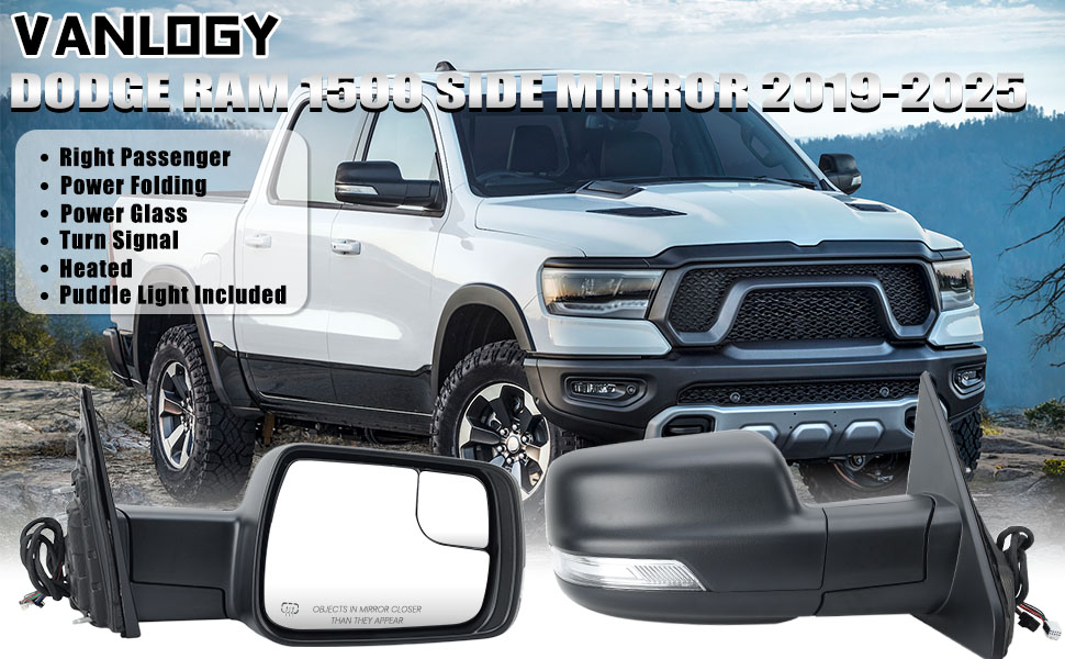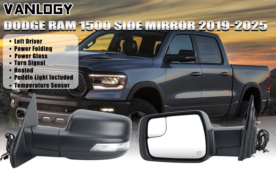 Features: Power Folding | Heated | Power Glass | with Turn Signal Indicator | with Puddle Light | Temperature Sensor. Note: The driver side has an auto-dimming feature but does not have auto-dimming glass; Laramie, Limited, and Long Horn models have a memory function, which this rearview mirror assembly does not support