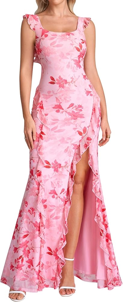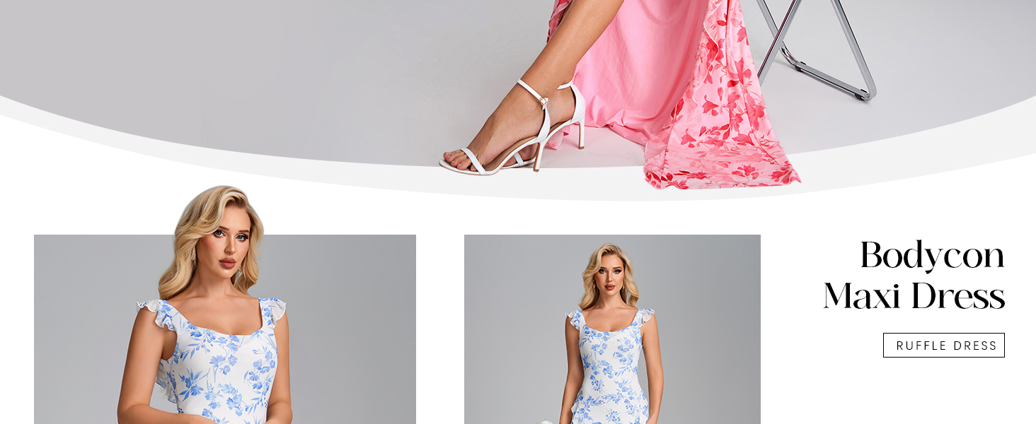Flattering Bodycon Silhouette: Designed with a form-fitting bodycon cut, this dress hugs your curves in all the right places. The high side slit and cascading ruffle hem create graceful movement, while the square neckline beautifully frames your collarbone for a polished look