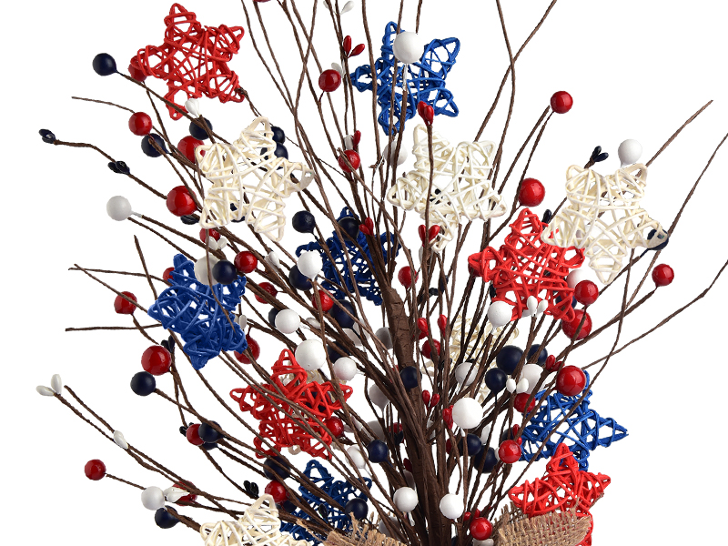4th of July Patriotic Table Tree: Independence Day table tree designed with red white and blue colors, 20 inch patriotic artificial table tree consists of cement base and vines and assorted artificial berries and stars shaped rattan balls in America flag colors, star and round which will add an extra touch to your home