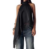 Lace Asymmetrical Halter Top: Girls stylish black lace trim y2k halter top, trendy sexy cutout back asymmetrical satin tank top, coquette cute off shoulder halter neck lace patchwork tank shirt, solid color grunge backless loose fit asymmetric hem going out tops for women