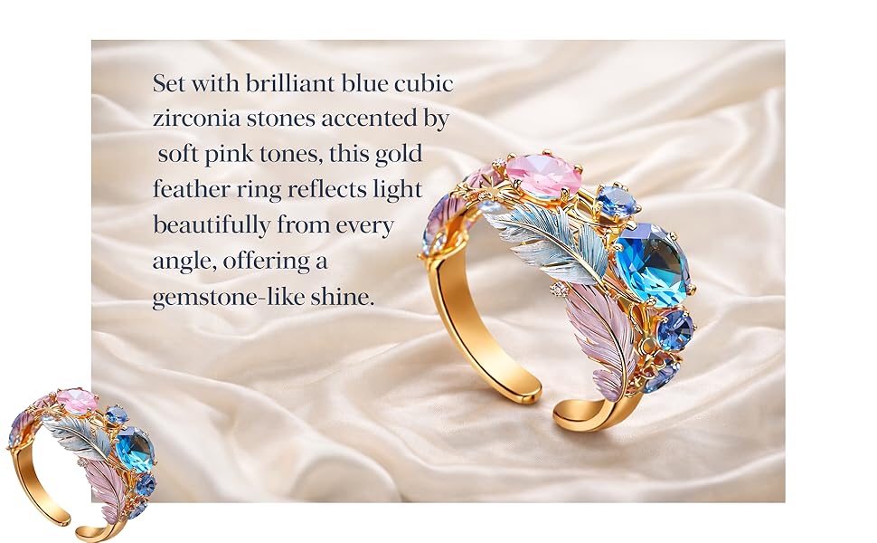 [Sparkling Blue Cubic Zirconia] - Set with brilliant blue cubic zirconia stones accented by soft pink tones, this gold feather ring reflects light beautifully from every angle, offering a gemstone-like shine