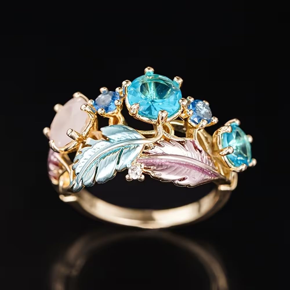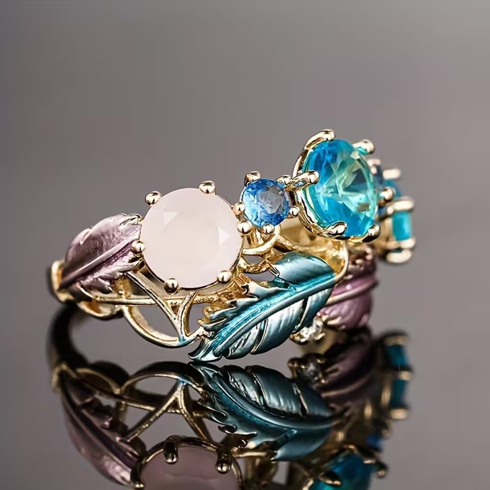 [Elegant Feather Design] - Inspired by delicate feathers and nature elements, this blue cubic zirconia feather ring features flowing leaf details and faceted stones, creating a graceful boho statement look that feels artistic yet feminine