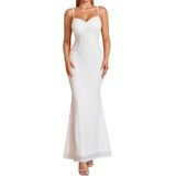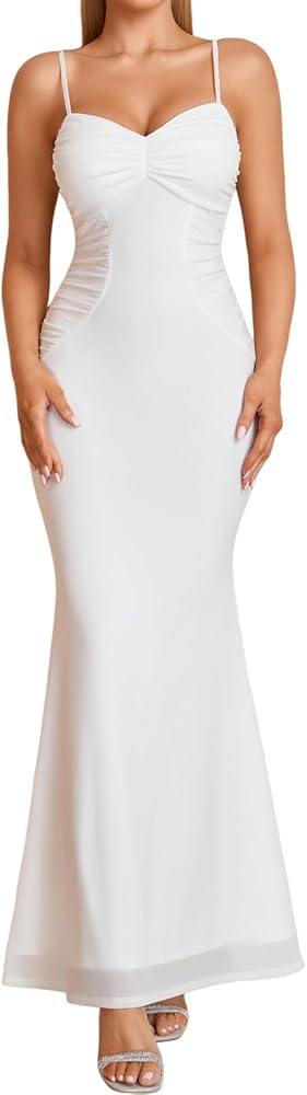 Designed with a v neck, ruched, and a curve-enhancing bodycon silhouette, this long dress highlights natural curves beautifully. Spaghetti straps are adjustable for a customized fit, while the hidden back zipper ensures easy on and off with a seamless finish