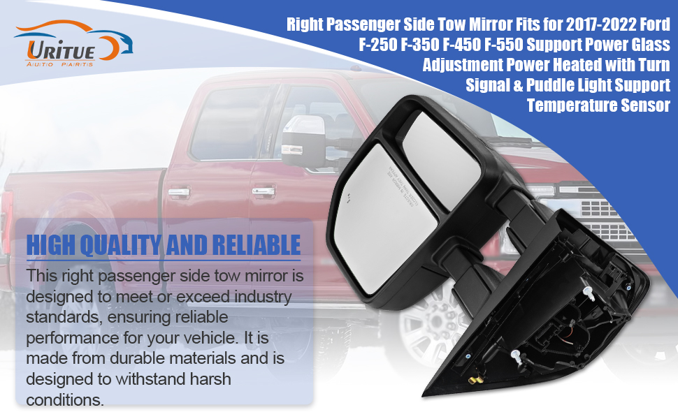 【Item Features】This right passenger side tow mirror fits for 2017-2022 Ford F-250 F-350 F450 Super Duty. Item features: support power glass adjustment, power heated, manual folding, with BSM signal light, with turn signal light, with puddle light,support temperature sensor.