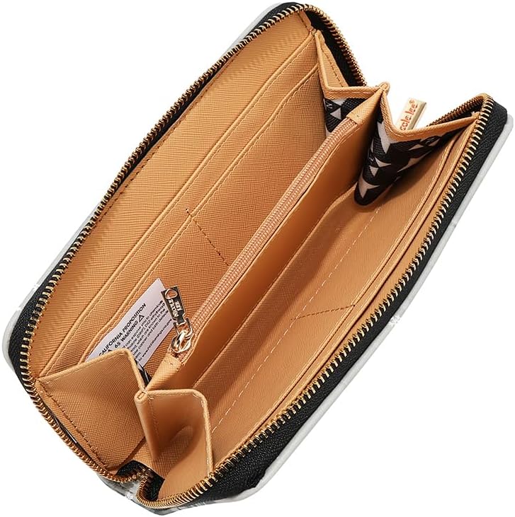 MATCHING WALLET: Designed with wrap-around zip closure, 4 card slots, 2 note sleeves, and center zip coin compartment, measuring 7.5" L x 1" W x 4" H.