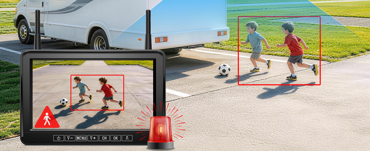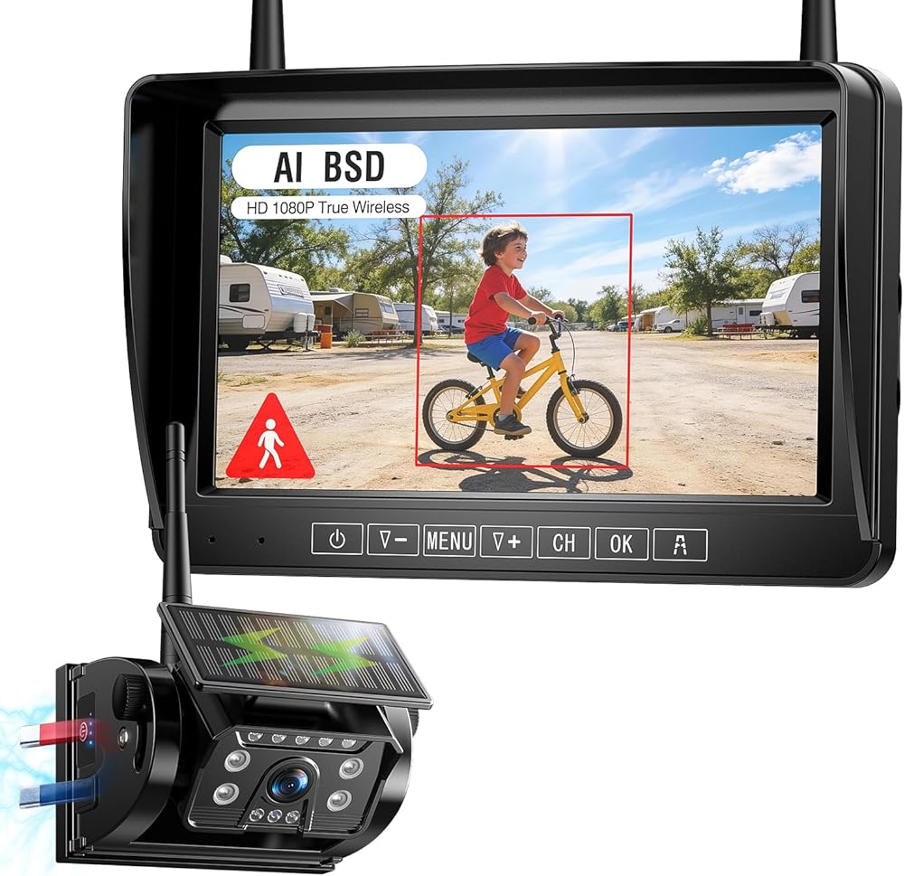 Crystal Visual with Stable Wireless Signal: Experience a sharp, stable view with our 1080P full HD camera and zero-latency transmission technology. Paired with a 7-inch IPS screen and dual-antenna design, it delivers smooth, real-time footage with enhanced signal stability. Supports 2 camera channels for a dual-split screen display to minimize blind spots.