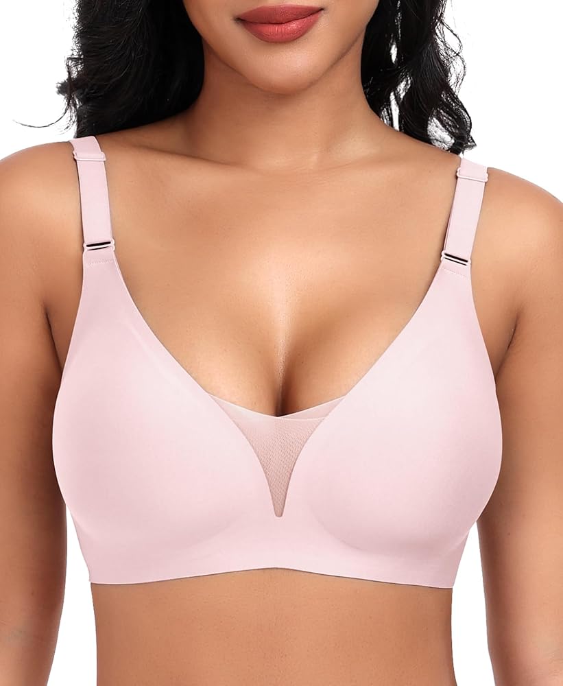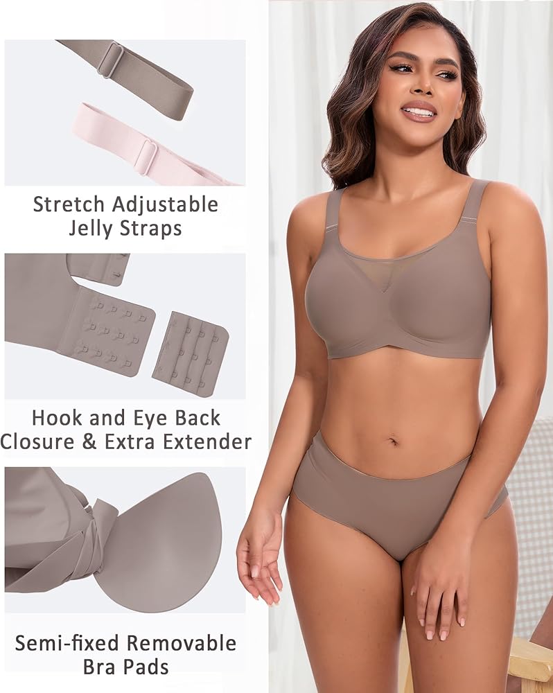 Elegant Mesh Wireless Push Up Bra:This no wire women's bra is made from a blend of 55% Nylon and 45% Spandex, bras feature lace mesh front design and innovative 3D support technology formed by the liquid jelly strip provide 360°round support for your breasts, creating a fully and natural-looking Chest without the discomfort of a traditional underwire bra. The removable pads are made from breathable material for a cool and comfort fit that is perfectly gentle on your skin.