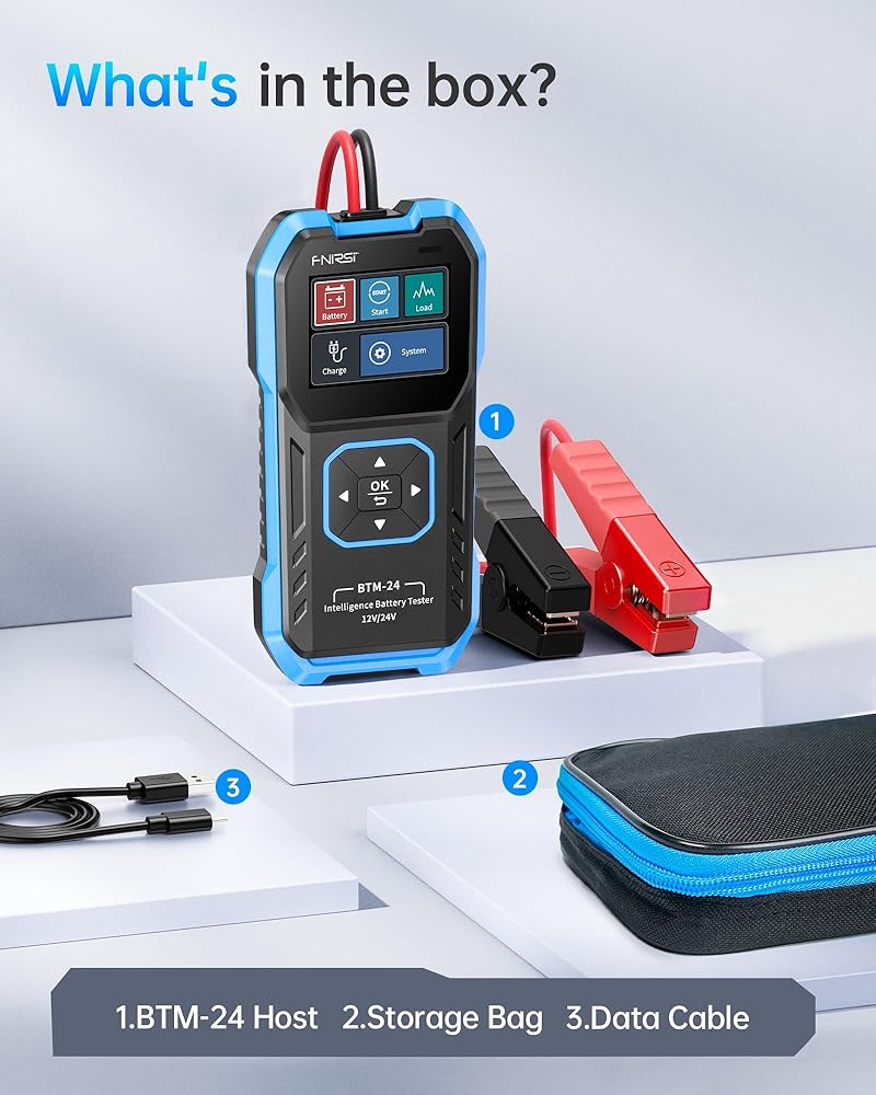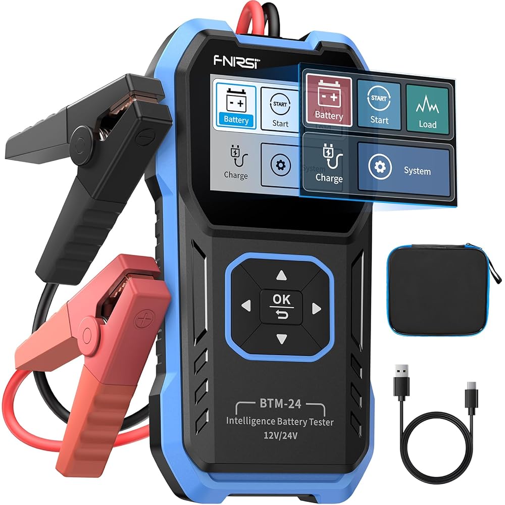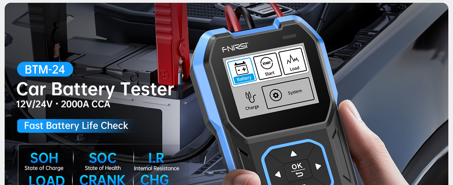 【12 V/24 V Battery Analyzer】FNIRSI BTM-24 car battery tester supports CCA 0–2000 A, accurately measures battery health (%), voltage, and internal resistance, and performs cranking, load, and charging diagnostics to ensure reliable battery performance and vehicle operation