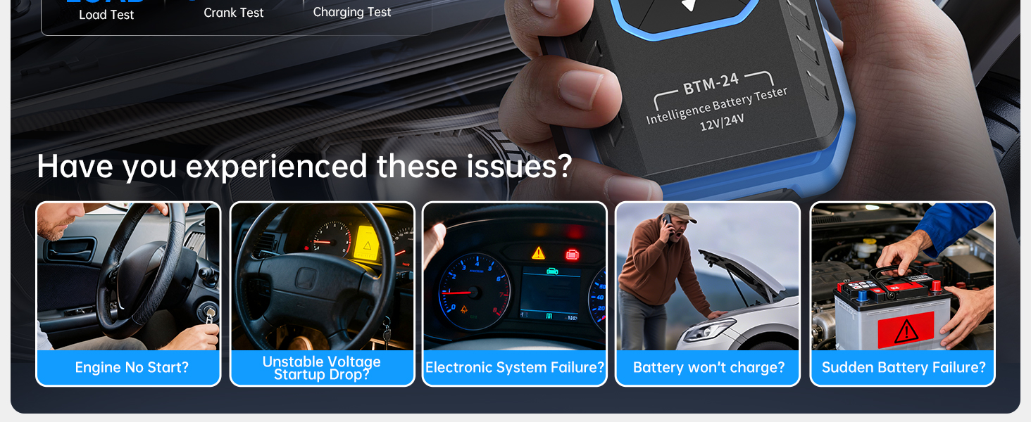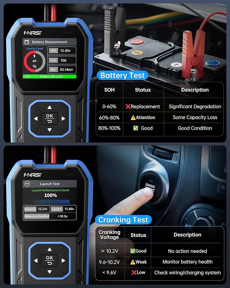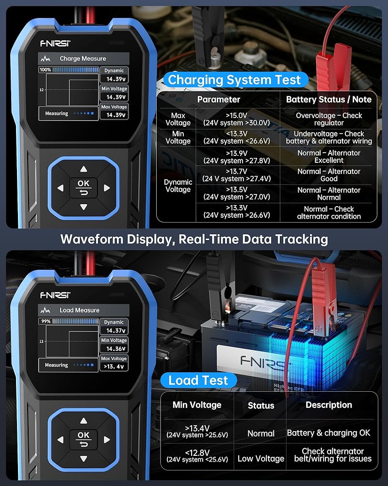 【Smart Battery Load Tester】Battery test shows voltage, internal resistance, and health (%) as “Good/Fair/Low.” Cranking checks engine start. Load monitors min and dynamic voltage; charging tracks min, max, and dynamic voltage, both with waveform views for easy monitoring analysis