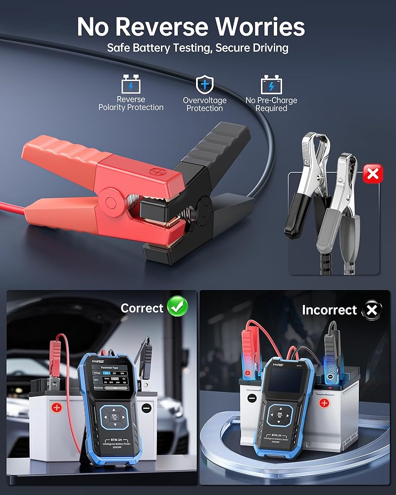 【Enhanced Safety Protection】Battery tester features reverse polarity and overvoltage protection, with upgraded insulated clamps that isolate conductive metal parts to prevent reverse connection damage, short circuits, and electric shocks