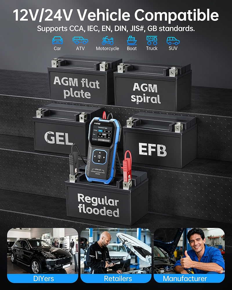 【Wide Application】Suitable for cars, trucks, SUVs, RVs, ATVs, motorcycles, boats, and more; supports Regular Flooded, AGM Spiral/Flat, GEL, EFB, and LAB/EV LAB batteries; meets CCA, IEC, EN, DIN, JIS#, and GB standards for reliable diagnostics