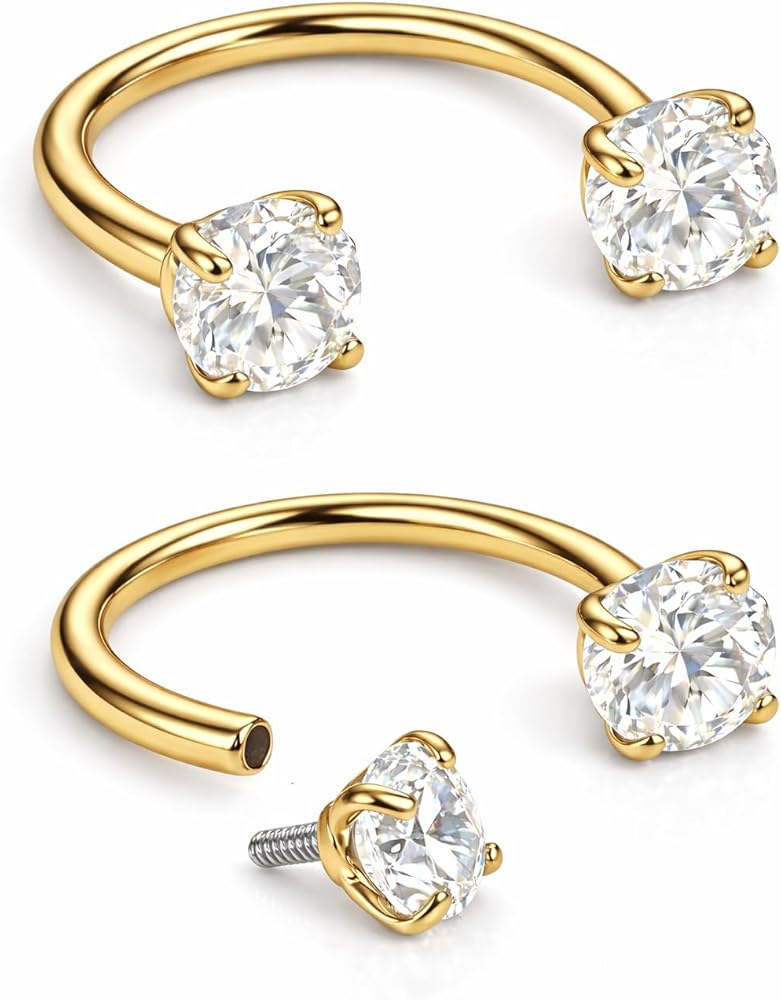 These internally threaded horseshoe nose rings are designed for smooth, irritation-free wear. The gem ends screw into the bar rather than over exposed threads, reducing the risk of scraping or tearing delicate piercing tissue during insertion or removal. This internal threading also provides a more secure fit than threadless designs, making the double gem horseshoe nose ring suitable for healed piercings and reliable daily wear.